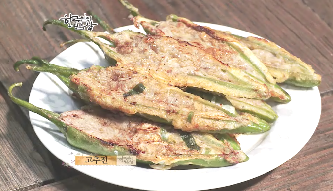 ‘고추전’은 배를 갈라 소고기와 야채를 다져서 넣고 전옷을 입혀 지져냅니다.