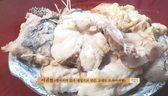 ‘아귀찜’은 찜통에 솔잎을 놓고 아귀를 손질해서 올리고 쪄냅니다. 솔잎 향기로 비린내가 가신다고 합니다. 이 아귀찜은 살과 껍질, 내장이 다 다른 맛이 나기 때문에 하나씩 골고루 맛을 봐야한다고 합니다. 아귀 간은 고소합니다. 위는 찌면 아주 꼬들꼬들합니다. 간과 위는 쪄서 초고추장에 찍어먹으면 맛있다고 합니다.