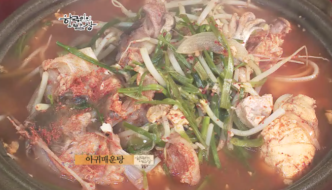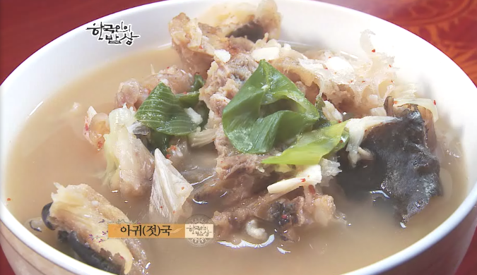 이 할머니네 ‘아귀 맑은탕’은 끊는 물에 아귀를 넣고 끊이고 위에 뜨는 거품을 거두면서 끊이고 콩나물, 미나리, 말이(해초)를 넣고 끊입니다. 특별한 간을 안해도 시원한 맛이 납니다.