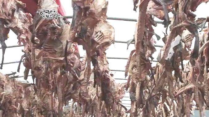 아귀는 찬바람불 때 말려야 더 잘 마른다고 합니다. 11월부터 3월까지 말립니다. 비가오면 말린 아귀를 방수포로 덮어야 합니다. 덮지 않으면 고기 자체도 상하고 살이 처집니다. 녹였다 말렸다하면 살에 구멍이 생기고 살이 푸석푸석해져 아귀의 제 맛이 안 난다고 합니다. 아귀를 말리는 덕장은 다른 지역에서 볼 수 없는 희귀한 곳입니다.