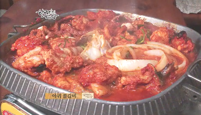‘아귀불갈비’는 생아구에 낙지 등과 함께 야채와 매콤한 양념을 부어 손님상에서 바로 조려 먹습니다.