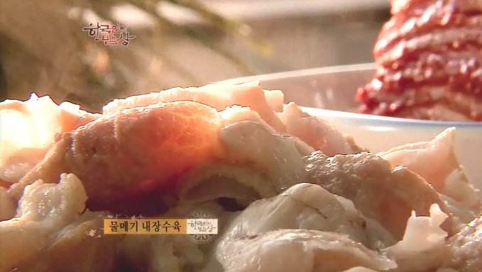 ‘물메기 내장수육’은 끊는 물에 깨끗이 씻은 물메기 창자를 끓는 물에 쫄깃하게 삶습니다. 그리고 먹기 좋게 자릅니다. 그래서 김치와 싸먹습니다. 물메기는 바닥에 몸을 붙이고 새우를 먹고 사는데 그래서 내장 속도 깨끗하고 맛있답니다.