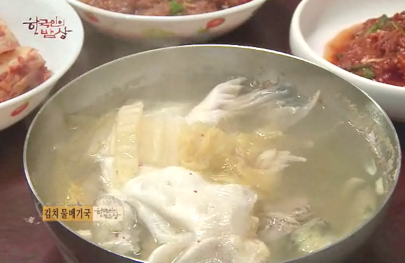 ‘김치 물메기국’은 김치를 잘게 썰어 물끼를 꼭 짜주고 끊는 물에 넣습니다. 물메기는 손질하여 토막을 크게 내어 준비합니다. 김치가 어느정도 익으면 물메기를 넣고 끊입니다. 이 국은 물양이 중요합니다. 물메기에서 물이 나오기 때문에 물을 많이 넣으면 맛이 없어진답니다.