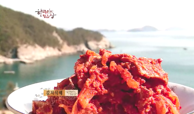 ‘갈치식해’는 지난 여름 추도 앞바다에서 잡아 보관해놓은 갈치를 손질하고 마늘과 생강을 절구에 찧어 준비합니다. 갈치를 소금과 마늘 생강과 섞어 15일 이상 두어 발효시킵니다. 조밥을 짓고 무를 고춧가루와 버무려서 보리와 엿기름을 넣고 삭힌 갈치와 조밥을 넣고 고춧가루 더 넣고 비벼줍니다.
