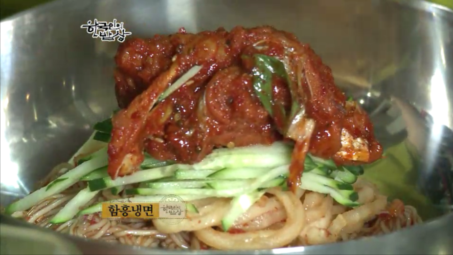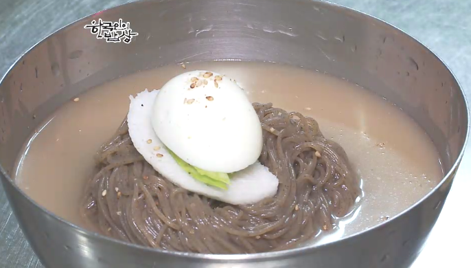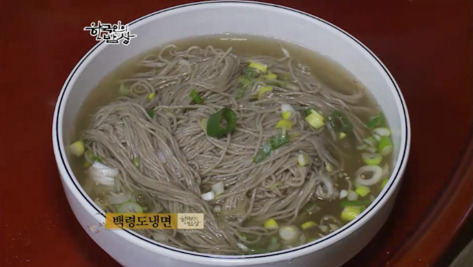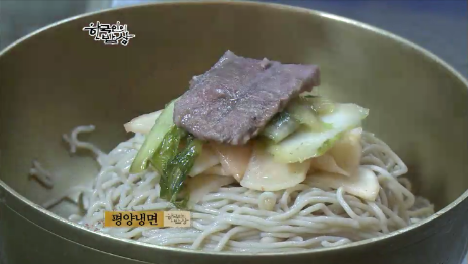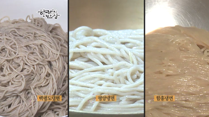 유난히 겨울이 길었던 황해도의 겨울별미였던 ‘황해도식 냉면’을 먹습니다. 면 반죽을 한 뒤에 국수틀에 눌러 면을 뽑으면서 바로 삶을 뒤에 건진 다음 찬물에 씻어 물기를 제거 하고 그릇에 담습니다. 그리고 얼얼한 차가운 육수를 부어 먹습니다.