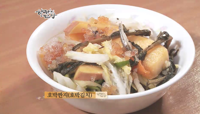 백령도에서는 ‘호박짠지’가 토종음식이고 이것이 없으면 김치가 안 되는 것으로 생각합니다. 제일 먼저 생각하는 음식입니다. 고춧가루도 안들어가는 김치입니다. 이 김치에 물을 자작하게 붓고 끊어서 먹습니다. 꺽주기(삼세기)알을 씹으면 톡 터지는 맛과 쌉쌀한 맛이 나고 분지(산초)가 들어가서 개운한 맛이 난답니다.