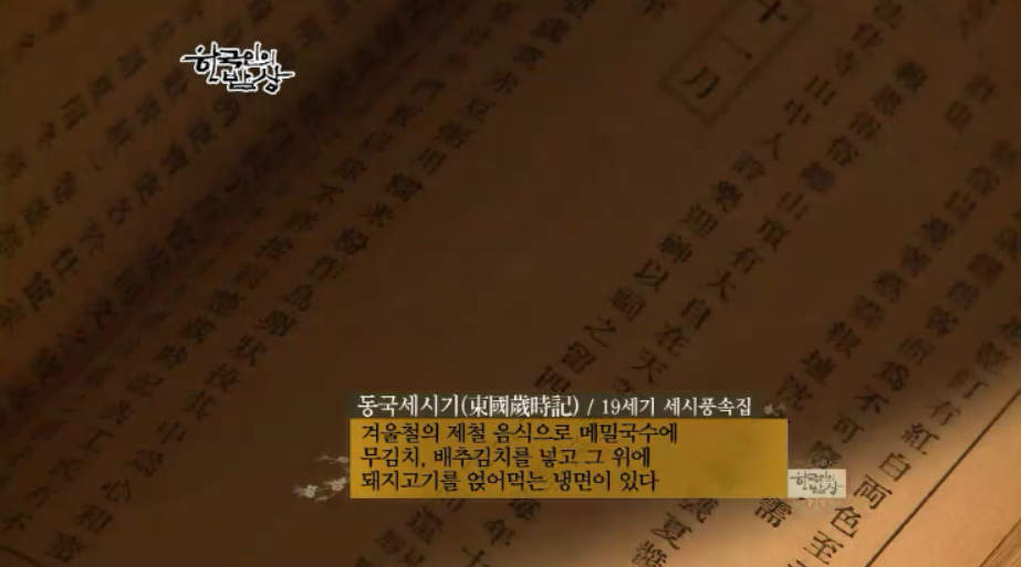 『동국세시기』에 보면 ‘겨울철의 제철 음식으로 메밀국수에 무김치, 배추김치를 넣고 그 위에 돼지고기를 얹어먹는 냉면이 있다.’라고 고유의 음식으로 소개되어있습니다. 예전에는 따뜻한 방안에서 시원한 냉면을 먹었습니다.