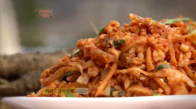 ‘더덕오징어식해’는 더덕을 잘게 채 썰고, 오징어도 채를 썰어서 다진 마늘, 더덕 가루, 고춧가루 등을 넣고 지은 쌀밥을 넣고 풀어지지 않게 잘 비빕니다. 그리고 2~3일 숙성을 시켜 먹습니다.