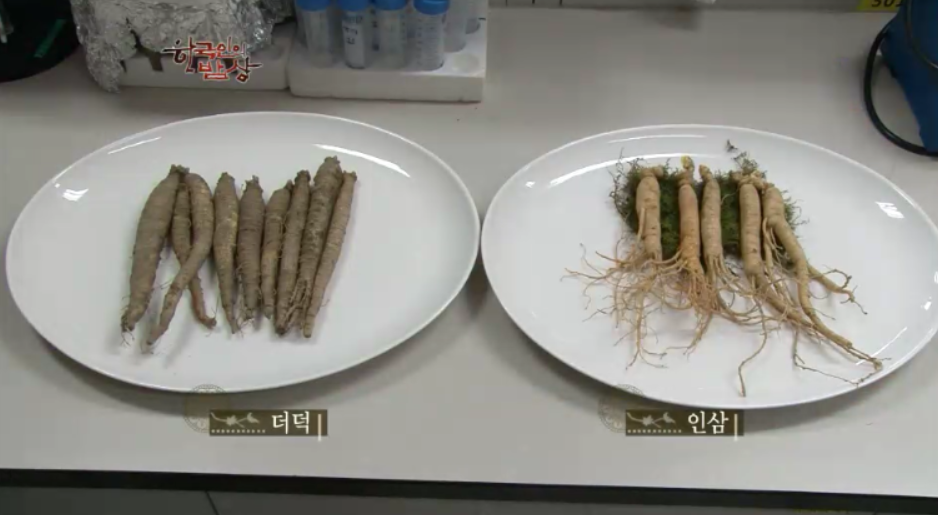 한의학에서 더덕은 음의 약재 찬기운, 인삼은 양의 약재 따뜻한 기운을 채워 줍니다. 탄수화물과 단백질은 비슷하지만 수용성 식이섬유는 더덕이 더 많습니다. 더덕에 함유되어있는 수용성 식이섬유는 우리 혈중 콜레스테롤을 낮추는데 아주 효과가 있는 성분입니다. 그리고 더덕에 들어있는 사포닌은 인삼의 주성분으로 알려진 그 양만큼 포함되어 있습니다.