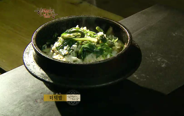‘더덕밥’은 더덕물을 넣어서 밥을 짓습니다. 그리고 더덕을 갈아 취나물 데친 것어 넣고 밥을 넣고 들기름, 해바라기씨, 호박씨를 넣고 잘 비벼줍니다. 그리고 뚝배기에 넣고 물을 붓고 다시 한 번 끊여서 뜸을 드려 밥을 짓습니다. 두 번 밥을 짓는 것이 포인트입니다.