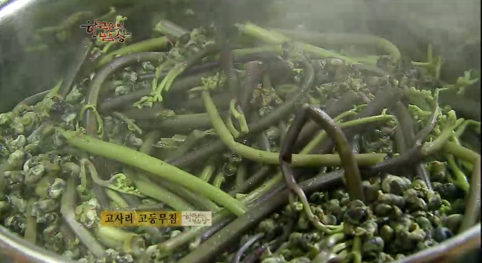 ‘고사리 고둥무침’은 햇고사리는 끊는 물에 푹 삶습니다(그래야 독성이 살아짐, 말리면 갈색으로 변함.). 그리고 다시 팬에 넣고 고동을 넣고 간장과 참기름을 넣고 볶습니다.