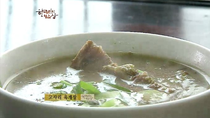 ‘고사리 육개장’은 남은 뼈다귀 국물에 삶은 고사리를 잘게 썰어 넣습니다. 끓으면 메밀가루를 물에 풀어서 넣고 끓여줍니다.