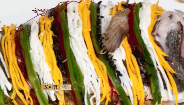 ‘도미찜’은 등에 칼집을 넣어 내장을 제거하고 도미살과 숙주, 고사리, 미나리를 삶아 손가락 마디 정도로 자르고 도미살을 다진 것과 된장, 고추장을 넣어 버무려서 등에 채웁니다. 그리고 미나리로 묶어서 찜통에서 찌는데 너무 푹 쪄지지 않게 쪄야합니다. 그리고 계란 황백지단, 실고추, 쪽파를 올려줍니다.