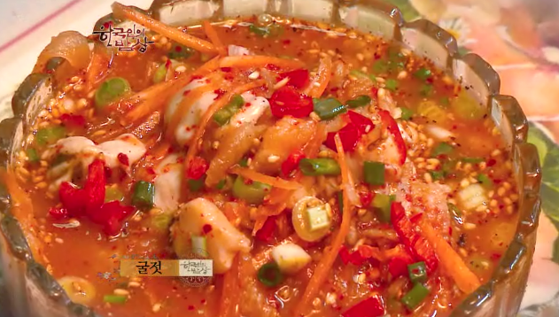 ‘굴젓’은 굴을 쌀뜨물에 일주일 삭히면 동동 떠오르는데 여기에 국물을 따라놓고 고춧가루와 소금을 넣고 배랑 무는 숟가락으로 긁어서 넣습니다. 그 다음 당근채치고, 쪽파 당근길이로 썰고, 홍∙청고추 어슷썰기하고 국물을 넣습니다. 통영사람들에게 굴요리를 물어보면 거의 굴젓이라고 대답한다고 합니다.