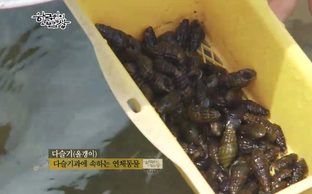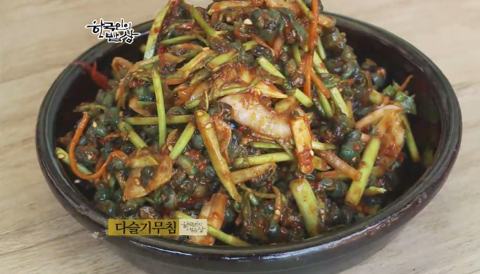 ‘다슬기 무침’은 미나리, 당근, 양파, 오이채를 썰고 올갱이 알맹이들을 넣고 초고추장과, 고춧가루를 넣고 새콤달콤하게 무칩니다.