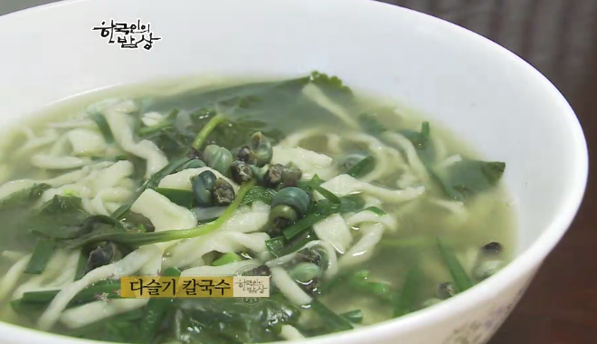 ‘다슬기 칼국수’는 밀가루 반죽을 해서 길게 밀어 잘라 국수면을 만들고 다슬기 우리 물이 끊으면 면을 넣고 다슬기 알맹이를 넣고 마지막에 부추를 넣어 끊입니다.