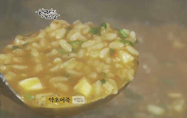 ‘약초어죽’은 잡아온 물고기를 손질을 한 다음에 끊는 물에 넣고 푹 삶습니다. 건더기를 채에 걸러서 곱게 내린 다음에 엄나무잎, 민들레, 산초 등을 잘게 썰어 준비하고 고춧가루, 고추장, 된장을 섞어 양념장을 만들어 놓고 물에 찹쌀을 넣고 끊여서 어느 정도 익으면 양념을 넣고 끓이다가 약초들과 파를 넣고 끊입니다.