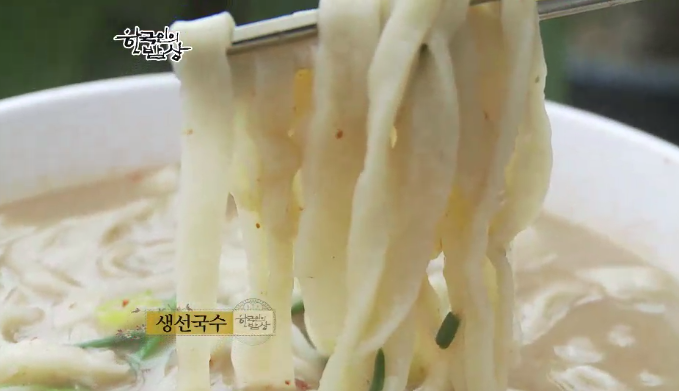 ‘생선국수’는 끓는 물에 날콩(생선 비린내를 잡아줌)을 넣고 여러 민물고기를 손질해서 넣고 끓입니다. 그리고 채에 된장을 풀고 푹 3~4시간 끊여줍니다. 그리고 나서 걸러서 가시를 발라내고 국물만 끊여줍니다. 밀가루 반죽을 해서 칼국수 면을 만들어 넣고 호박채를 넣어 끓입니다.