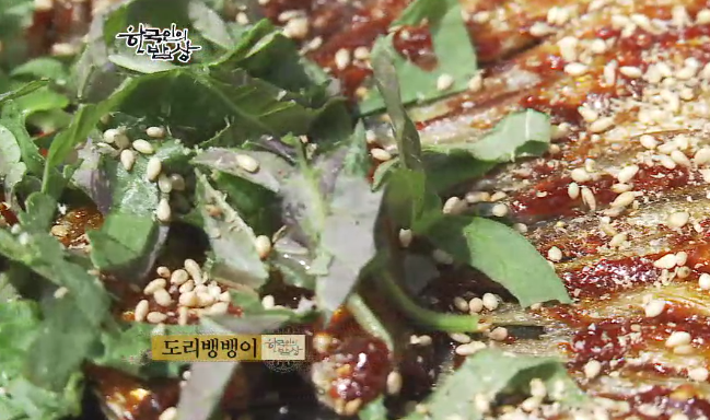 ‘도리뱅뱅이’는 팬에 피라미들을 물기를 쫙 뺀 다음에 눈도 맞추고 꼬리도 맞춰서 뱅 돌려서 깐 다음 식용유를 잡길 정도로 부은 다음에 튀겨 냅니다. 그리고 식용유를 부어내고 그 위에 고추장 양념을 바르고 깨소금을 뿌려줍니다.