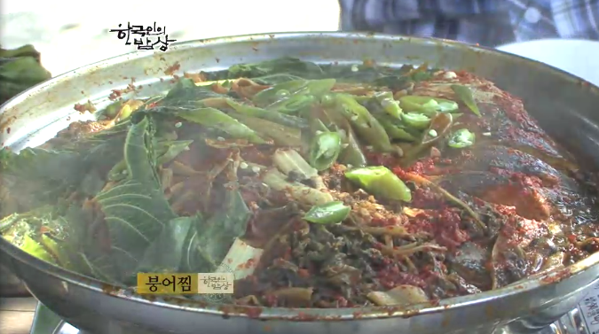 ‘붕어찜’은 붕어를 칼 등으로 긁어 비늘을 다 제거하고 손질 후에 칼집을 내줍니다. 그리고 시래기를 미리 삶은 뒤에 꼭 짜서 준비합니다. 냄비에 시래기를 깔고 그 위에 양념장을 얻은 뒤에 붕어를 올리고 시래기를 또 올리고 양념장을 뿌리고 쪄냅니다. 그리고 깻잎과 고추를 썰어 넣고 한소끔 끓여줍니다. 그런데 붕어보다는 시래기를 먹으려고 한다고 합니다.