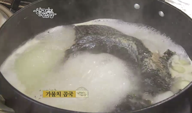 ‘가물치 곰국’은 냄비에 내장 손질한 가물치를 넣고 참기름을 넉넉히 넣고 불에 올리고 기름이 어느 정도 스며들면 물을 넣고 통마늘을 넣고 푹 끊여 뽀얀국물이 나올 때까지 끊입니다.
