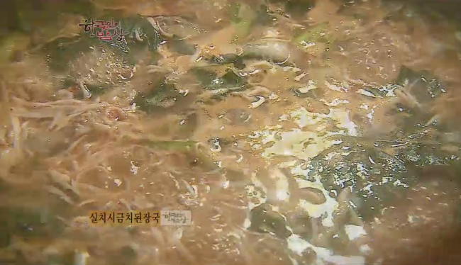 ‘실치시금치된장국’은 끓는 물에 된장을 풀고 생실치를 넣습니다. 그리고 시금치를 넣고 고춧가루를 살짝 넣고 끓입니다.