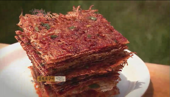‘실치포구이’는 파송송, 통깨, 고추장, 매식액을 섞은 뒤에 뱅어포에 바른 뒤에 팬에 구워 줍니다.
