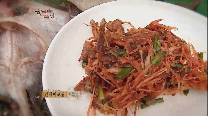 ‘간재미포찜’은 말린 간재미를 한 번 씻어 김오른 찜통에 넣고 10여 분정도 찝니다. 참기름, 통깨, 다진마늘, 고춧가루를 섞은 뒤에 찐 간재미를 찢어 넣고 파를 썰어 넣고 무칩니다. 말린 간재미가 더 쫀득하지 맛있다고 합니다.